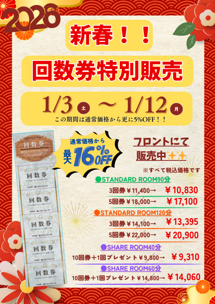 2025年も残りわずかとなりましたが、日頃より多くのお客様にご愛顧いただき、心より感謝申し上げます。このたびKUUMAでは、🎉 新春限定企画 として回数券の特別販売を実施いたします✨